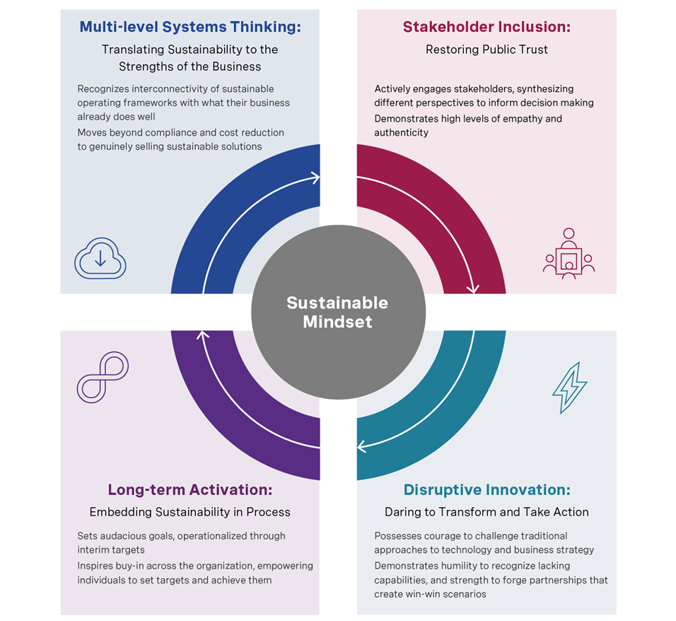To do this, organizations must make it clear that a sustainable mindset and the four leadership attributes critical to future success and viability – multi-level systems thinking, stakeholder inclusion, disruptive innovation and long-term activation – are requirements to be a senior leader.