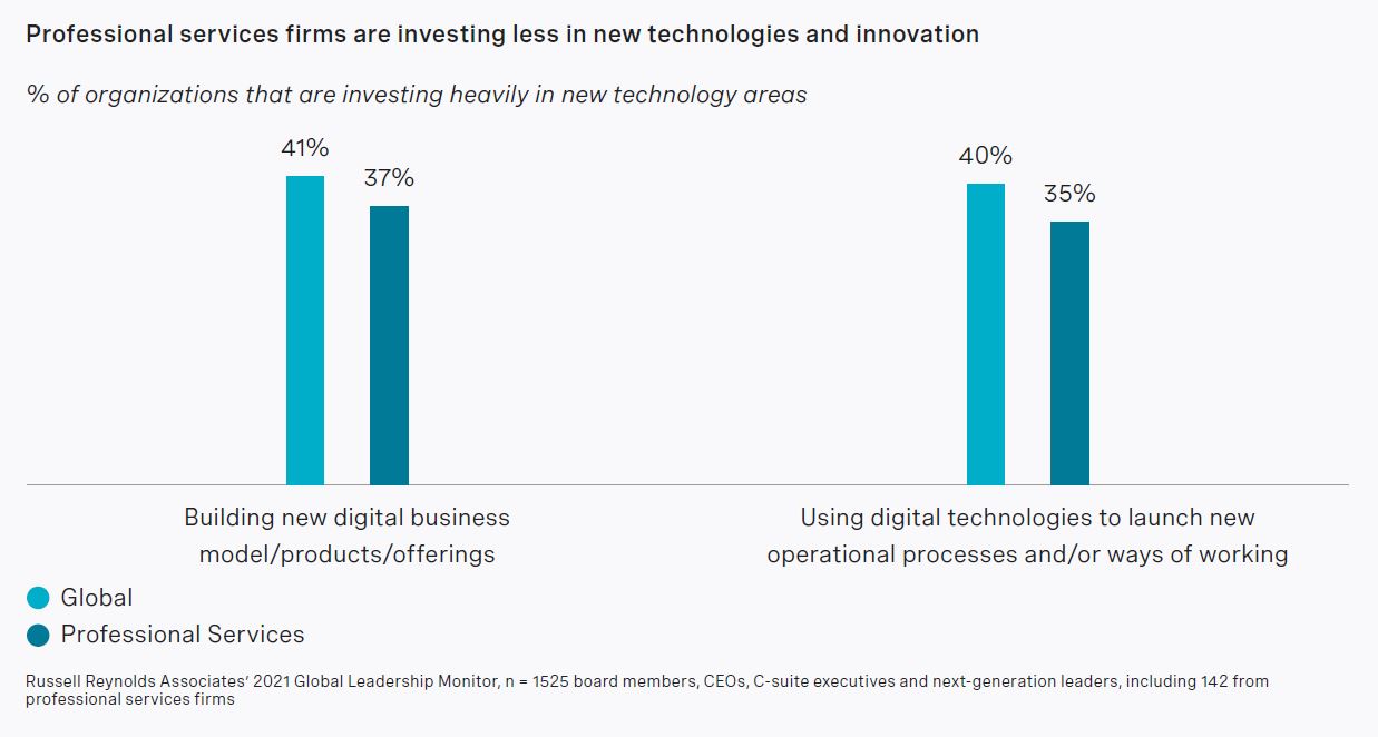 While executives in professional services have invested a large amount in technological innovation over the past two years, they may not be keeping pace for future growth