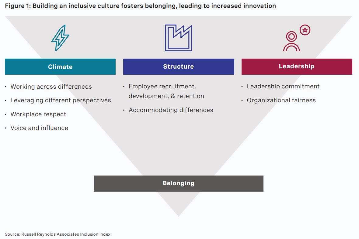Innovation thrives amidst diversity and multiplies within an inclusive culture. Important elements of an inclusive culture include cross-functional collaborations and data-driven decision-making processes. These characteristics can be quantified using climate, structure, and leadership metrics, to increase transparency and benchmark the organization’s levels of inclusion and belonging (see Figure 1)